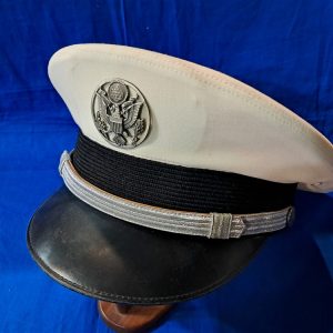 Army Visor White VN. Condition unissued. One of the best Visor caps I have has in Dress white. Also included is the Dress Black cover. Can be attached over or by taking the White cover off. Worn with the dress black dinner uniforms